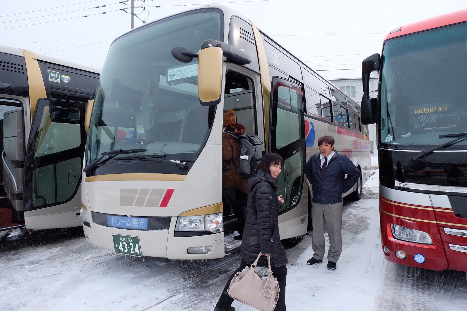 นอกจากนี้ยังมี ซังกิด้ง ザンギ丼 (880 เยน) และ ไคเซนด้ง 海鮮丼 (1,350 เยน) ทำด้วยวัตถุดิบสดใหม่ของฮอกไกโด น่าทานทุกอย่างเลยล่ะ ถ้าใครจะมาขึ้นเรือออโรร่าไปชมน้ำแข็งริวเฮียวก็ลองแวะทานดูนะจ๊ะ ทานข้าวเสร็จก็ได้เวลาย้ายสถานที่กันอีกแล้ว เราจะไปกันที่ “โซอุนเคียว” 層雲峡 ที่เป็นเมืองออนเซ็นขึ้นชื่ออีกที่ของฮอกไกโด ซึ่งตอนนี้กำลังมีอีเว้นต์น่าสนใจอีกด้วย ใช้เวลานั่งรถบัส 4 ชั่วโมงครึ่ง!! ใช่แล้วค่ะ ฟังไม่ผิดหรอก ก็ฮอกไกโดมันกว้างใหญ่มากกกก (เท่าที่ดูแผนที่ เราว่าใหญ่กว่าเกาะคิวชูทั้งเกาะอีกนะ แต่นี่คือฮอกไกโดแค่จังหวัดเดียว) การเดินทางระหว่างเมืองเลยใช้เวลามาก แนะนำให้ใช้รถบัสระหว่างเมืองจะสะดวกและปลอดภัยนะคะ โดยเฉพาะช่วงฤดูหนาว หิมะทับถมหนา ถ้าเราไม่เชี่ยวชาญการขับบนภูเขา อาจจะเกิดอันตรายได้ ในรถบัสนี้จริงๆ แล้วมันเป็นรถบัสทัวร์ที่รับคนเป็นเที่ยวๆ แต่เที่ยวนี้มีเฉพาะพวกเรา เลยดูเหมาะเช่าเหมาคันเลย 555 คุณลุงบัสไกด์ แกแต่งตัวเฟี้ยวมาก แถมยังใจดีให้ข้อมูลความรู้ดีๆ ระหว่างเดินทางอีกด้วย